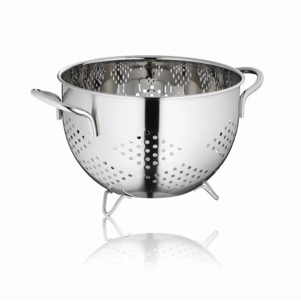 Passoire CHEFS&CO robuste en acier inoxydable 18/10. Stabilité assurée grâce aux 3 pieds. Les poignées facilitent la prise en main.