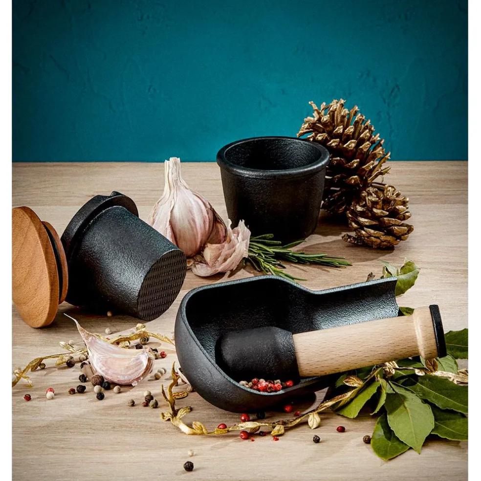Amateur d’épices et d’herbes ? Cet élégant mortier avec son pilon en fonte noir vont vous permettre d’obtenir des saveurs incroyables et de reléver le goût de vos plats.