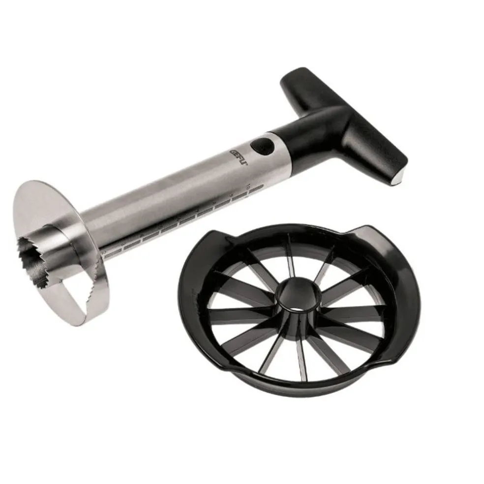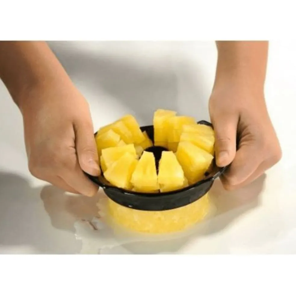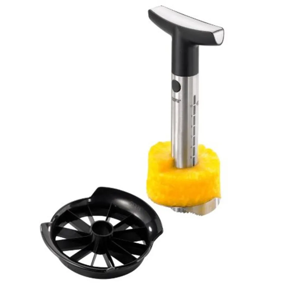 Le coupe-ananas permet de couper 12 quartiers à la fois. Placer l’axe centrale au-dessus de l’ananas puis tournez en maintenant enfoncer. Les indications gravées sur l’axe indiquent le nombre de tranches réalisées. Grâce à la poignée ergonomique la force rotatrice est optimale. Obtenez des morceaux parfaits d’ananas mais aussi de pommes et de poires.