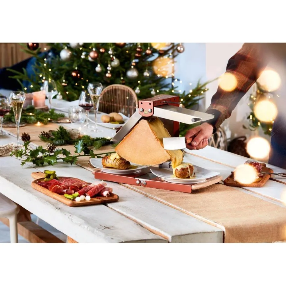 APPAREIL À RACLETTE TRADITIONNEL : Cet appareil à raclette permet de suspendre une portion de meule et de la chauffer en continu, pour un service à la demande. Avec une puissance de 230V, il convient pour une table de 1 à 4 convives.