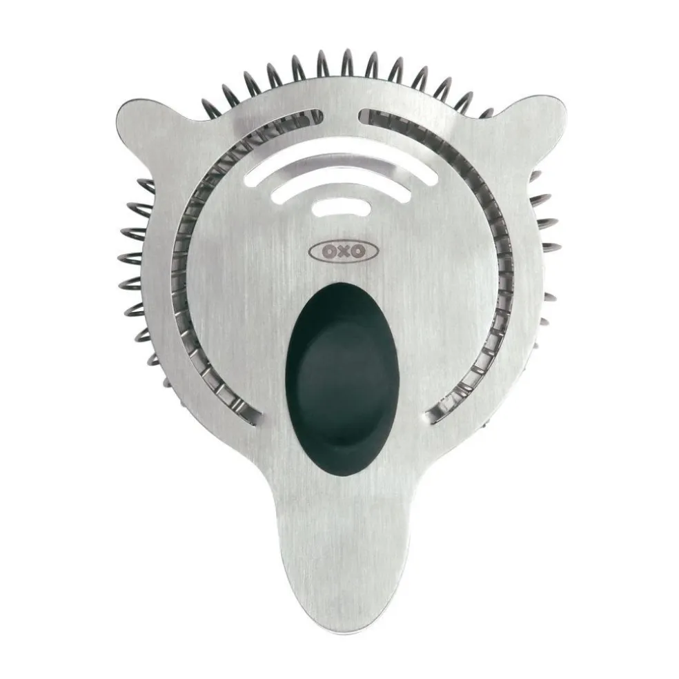 Passoire à cocktail OXO pour filtrer les pépins, les morceaux de fruits, les feuilles de menthe… après passage au shaker. Le gros ressort en acier empêche les glaçons de tomber pendant le service.