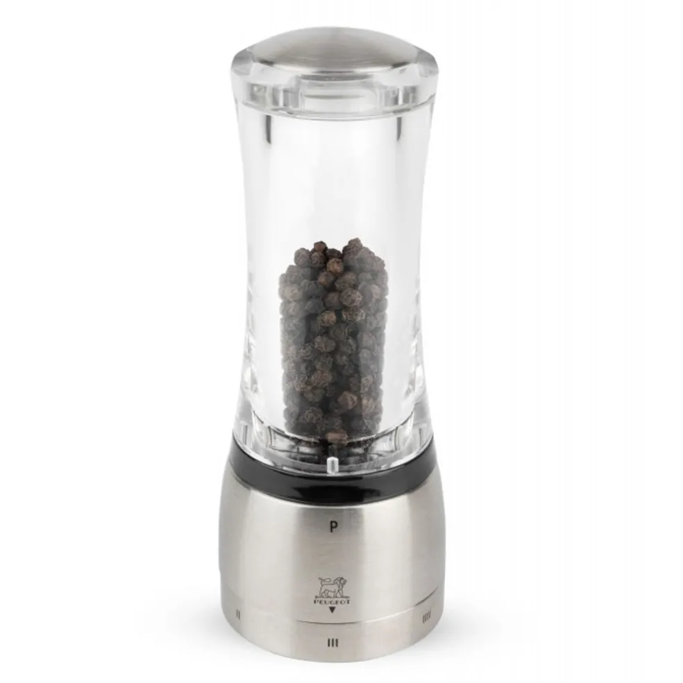 Ce moulin à poivre de la collection Daman de Peugeot dispose du réglage de la mouture breveté U’Select pour sélectionner la finesse souhaitée. 6 niveaux de réglage possibles. Le mécanisme est doté d’une double rangée de dents hélicoïdales pour guider les grains de poivre et les bloquer lors du broyage. Le couvercle du réservoir est aimanté pour un remplissage rapide et facile.