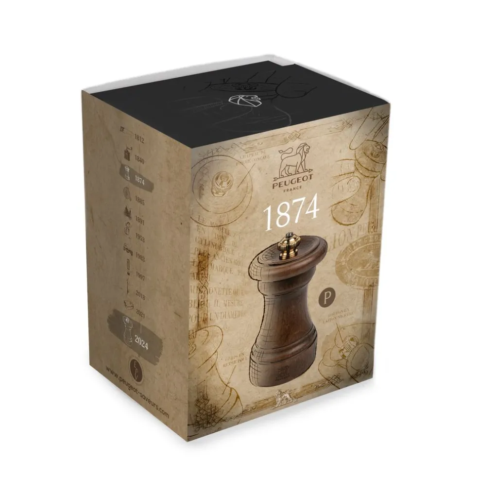 Disponible en hêtre finition patinée et présenté dans un élégant coffret, le moulin 1874 est soigneusement enveloppé dans une sachet de feutrine, offrant protection et charme intemporel. La touche finale de cette réédition est apportée au niveau du bouton bijou, fidèlement reproduit à partir de l’original. Il ajoute une note élégante au moulin dont on note la forme incurvée du chapeau.