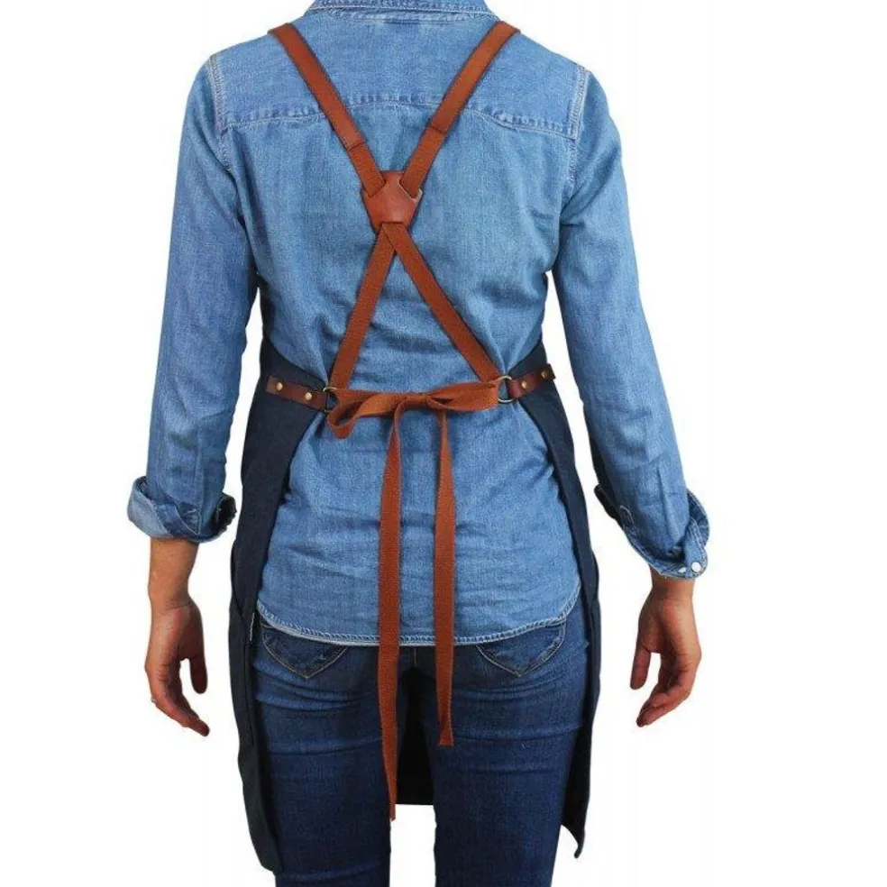 Sobre, pratique et confortable, ce tablier a tout pour lui : lanières en cuir (tannage végétal) ajustables, 1 ceinture pour ranger les ustensiles et torchons, 4 poches pour tout avoir sous la main.