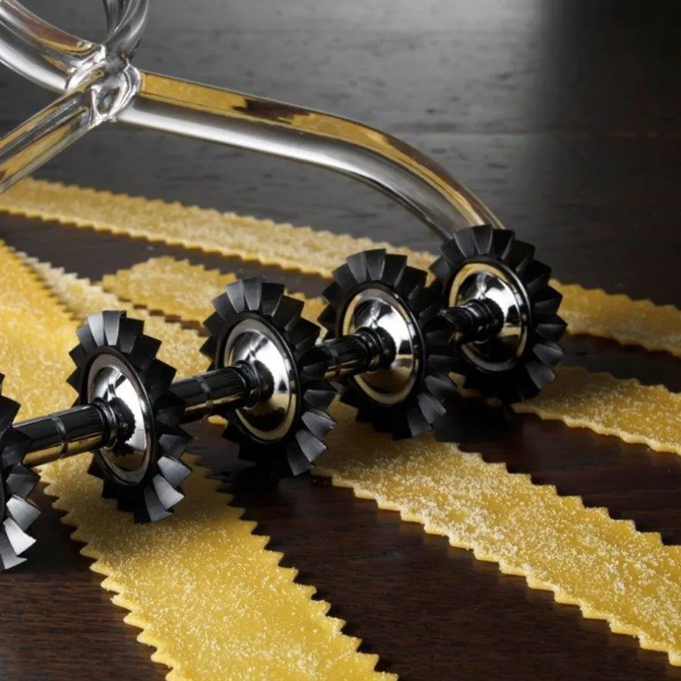La roulette Pastabike posède 9 roulettes amovibles et ajustables pour couper, en un seul geste, votre bande de pâte en lanières à la largeur souhaitée.