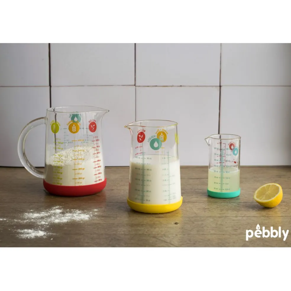 Ce doseur en verre dispose d’une base antidérapante en silicone amovible pour un lavage facile et d’un bec verseur pour verser facilement vos ingrédients dans votre préparation. Le verre doseur Pebbly permet de mesurer des aliments solides (en g) pour le riz, la farine, le sucre… ou liquides en (ml, cl, L) pour l’eau, le lait…
