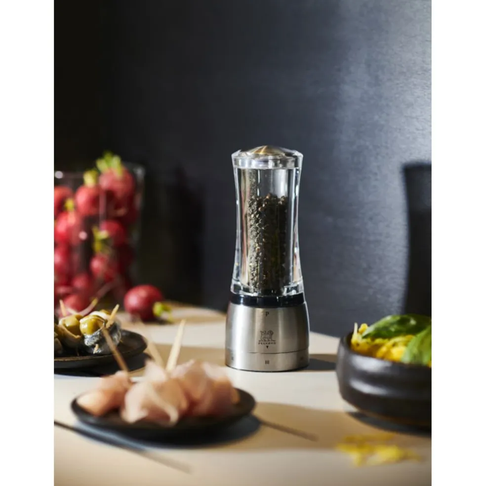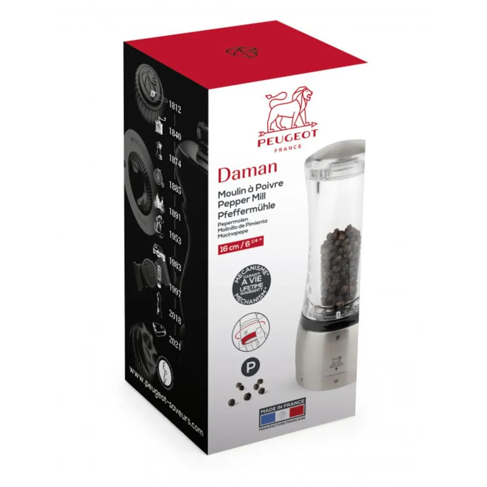 Ce moulin à poivre de la collection Daman de Peugeot dispose du réglage de la mouture breveté U’Select pour sélectionner la finesse souhaitée. 6 niveaux de réglage possibles. Le mécanisme est doté d’une double rangée de dents hélicoïdales pour guider les grains de poivre et les bloquer lors du broyage. Le couvercle du réservoir est aimanté pour un remplissage rapide et facile.