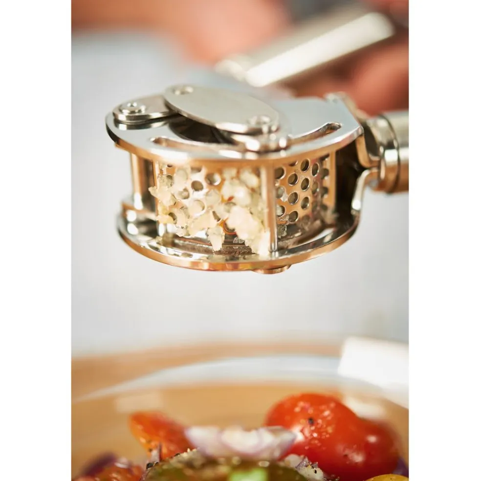 L’ail même non épluché est facile à presser grâce aux 54 perforations coniques du presse-ail Rösle. Son système de levier particulier minimise l’effort. La grille se soulève pour un nettoyage facile à l’eau courante.